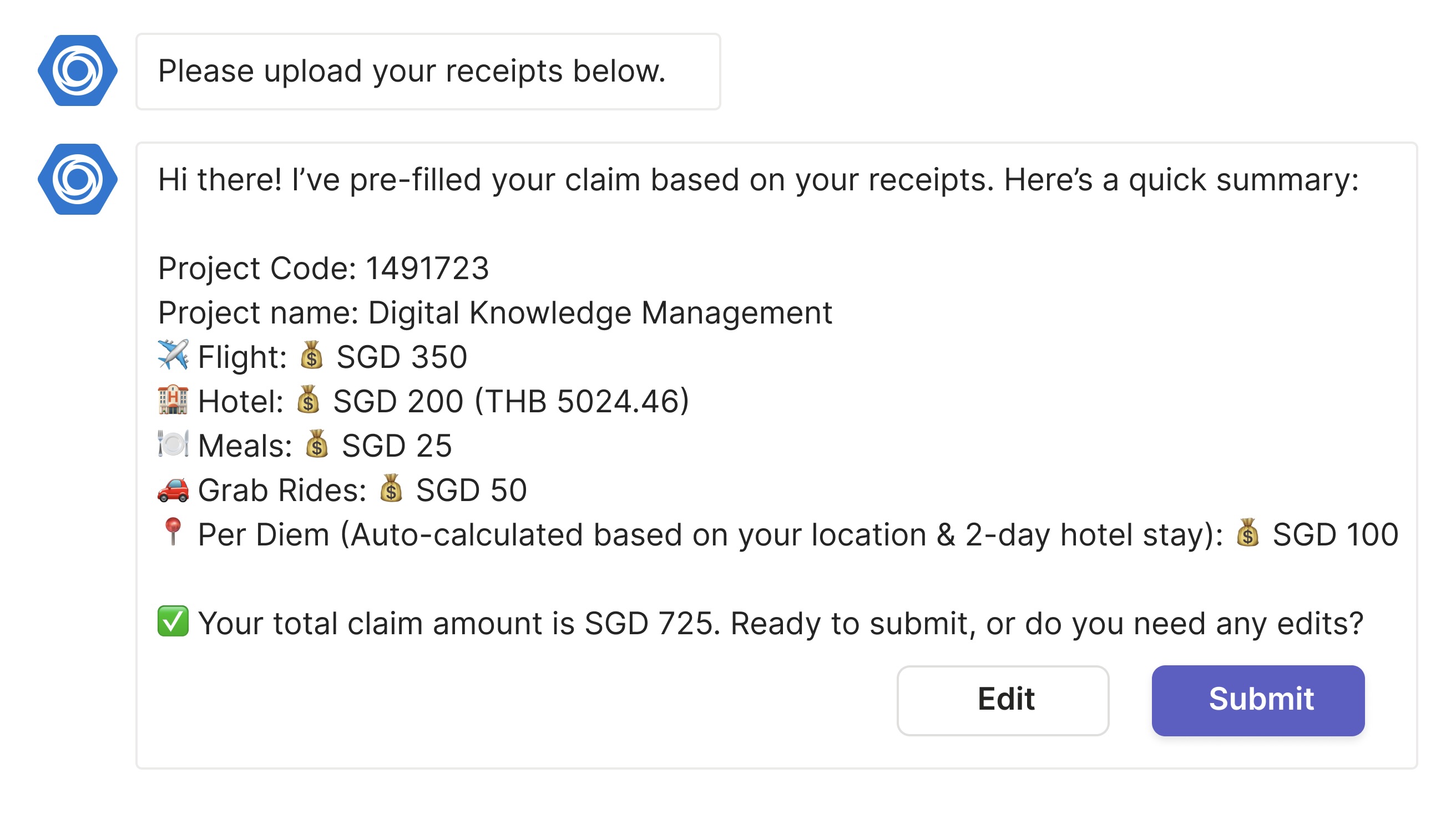 To address these challenges, we designed an AI-powered chatbot integrated with Microsoft Teams, a tool employees already use daily. This integration allowed us to streamline and accelerate the reimbursement journey by: